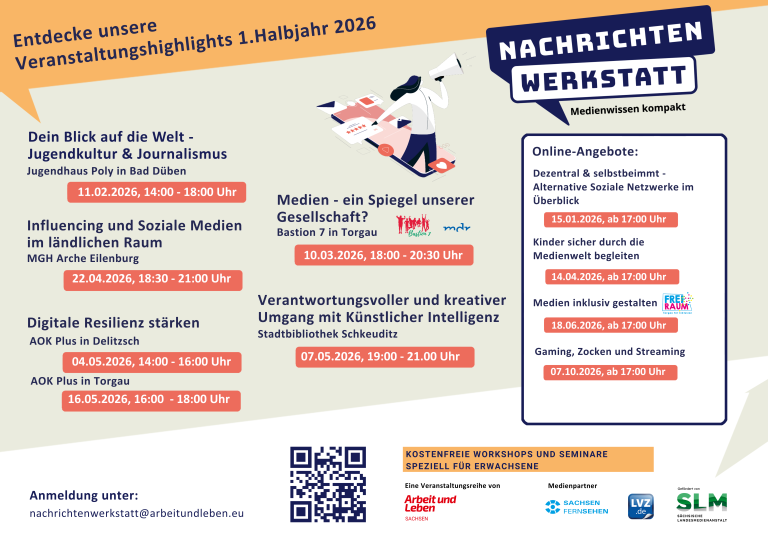 Wir bieten ein breites Spektrum an Angeboten rund um die Themen Journalismus, Medienkompetenz und digitale Bildung. Unser Ziel ist es, Menschen in ihrer Informations- und Nachrichtenkompetenz zu stärken, sie zu einem kritischen Umgang mit Inhalten zu befähigen und digitale Teilhabe für alle zu ermöglichen. Dabei arbeiten wir eng mit lokalen Akteur:innen, Bildungsträgern und der Zivilgesellschaft zusammen. Unser Wirkungskreis umfasst dabei die Altkreise Delitzsch, Eilenburg und Torgau. ARBEIT UND LEBEN SACHSEN e.V. setzt sich seit vielen Jahren für eine inklusive und vielfältige Medienbildung in der Region ein. Wir möchten, dass alle Menschen – insbesondere Eltern, pädagogische Fachkräfte und Bürger:innen – die Möglichkeit haben, sich mit relevanten Themen auseinanderzusetzen und ihre Meinungen öffentlich zu teilen.